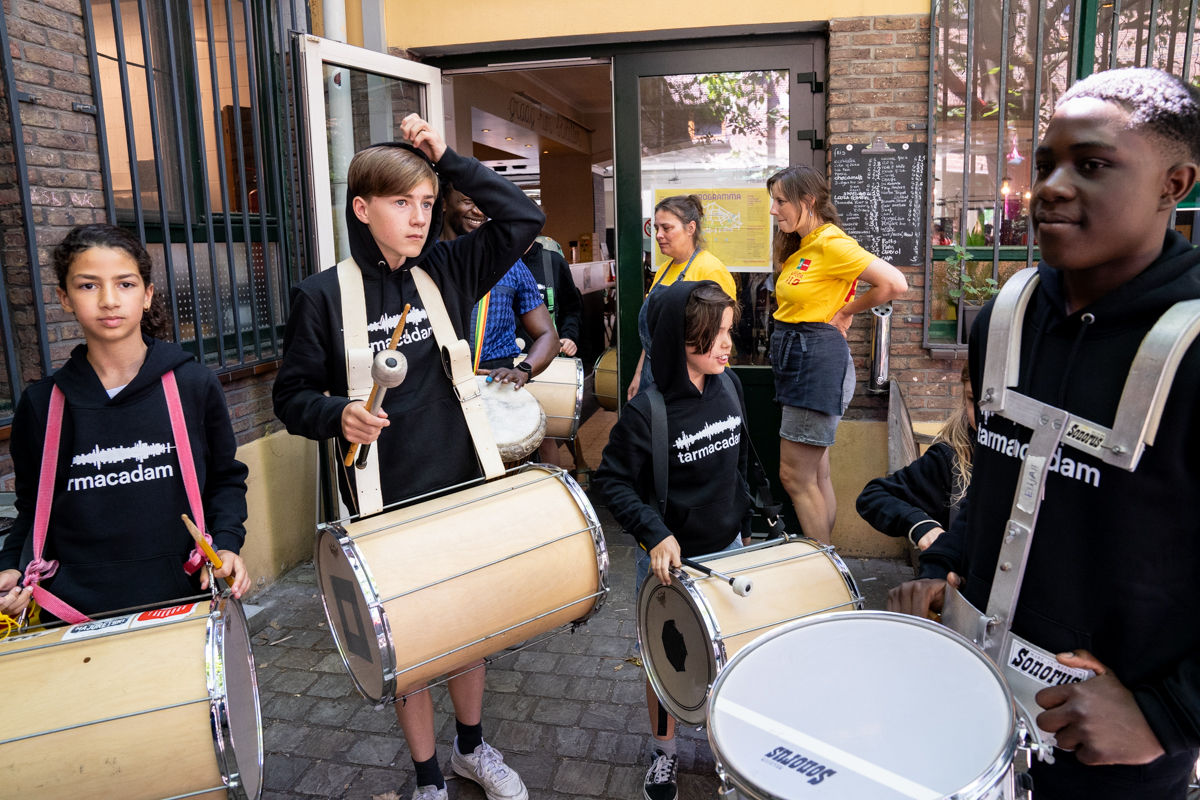 Het groove & percussie lab Tarmacadam speelt een bonte mix grooves en ritmische sounds met kinderen en jongeren.